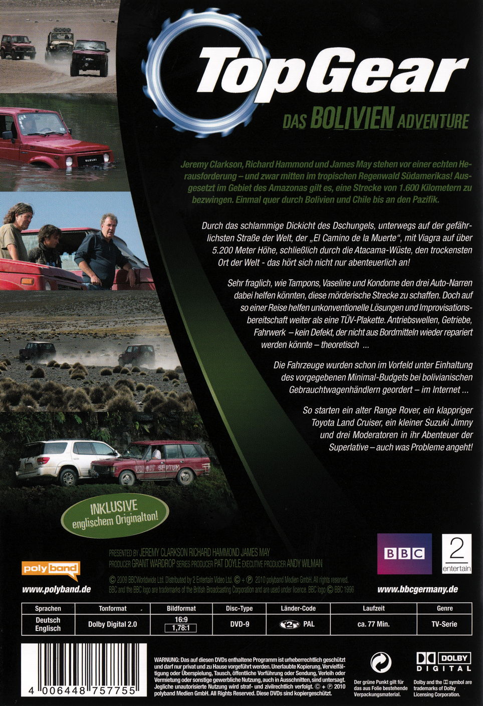 Die spektakulärste Auto-Show der Welt jetzt auf DVD: Jeremy Clarkson, Richard Hammond und James May stehen vor einer echten Herausforderung - und zwar mitten im tropischen Regenwald Südamerikas. Ausgesetzt im Gebiet des Amazonas gilt es, eine Strecke von 1.600 Kilometern zu bezwingen. Einmal quer durch Bolivien und Chile bis an den Pazifik. Durch das schlammige Dickicht des Dschungels, unterwegs auf der gefährlichsten Strasse der Welt, der 'El Camino de la Muerte', mit Viagra auf über 5.200 Meter Höhe, schliesslich durch die Atacama-Wüste, den trockensten Ort der Welt - das hört sich nicht nur abenteuerlich an! Sehr fraglich, wie Tampons, Vaseline und Kondome den drei Auto-Narren dabei helfen könnten, diese mörderische Strecke zu schaffen. Doch auf so einer Reise helfen unkonventionelle Lösungen und Improvisationsbereitschaft weiter als eine TÜV-Plakette. Antriebswellen, Getriebe, Fahrwerk - kein Defekt, der nicht aus Bordmitteln wieder repariert werden könnte - theoretisch. Die Fahrzeuge wurden schon im Vorfeld unter Einhaltung des vorgegebenen Minimal-Budgets bei bolivianischen Gebrauchtwagenhändlern geordert - im Internet. So starten ein alter Range Rover, ein klappriger Toyota Land Cruiser, ein kleiner Suzuki Jimny und drei Moderatoren in ihr Abenteuer der Superlative - auch was Probleme angeht.