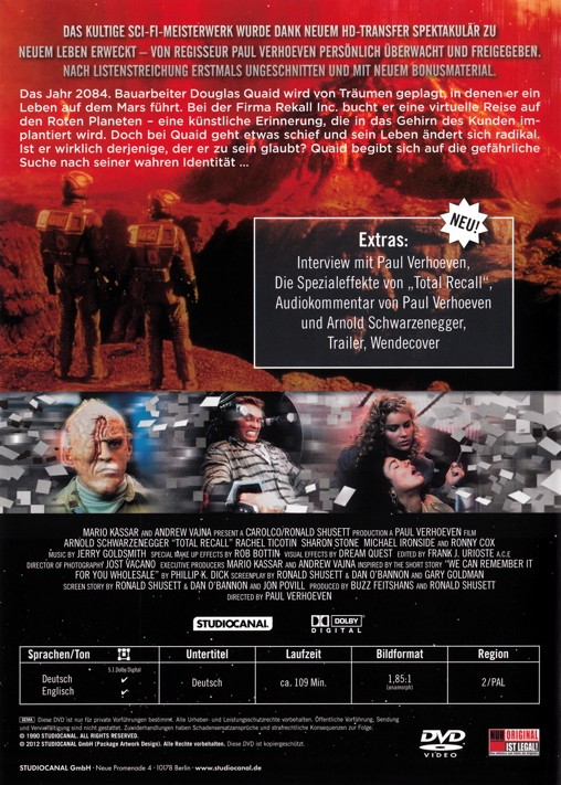 Das Jahr 2084: Bauarbeiter Douglas Quaid erfüllt sich seinen größten Wunsch. Eine Reise zum Mars, die jedoch nur in seiner Erinnerung stattfinden kann. Bei der Gehirn-Implantation seines Reisezieles durch die Firma "Rekall Inc." spielt plötzlich das Computerprogramm verrückt.
