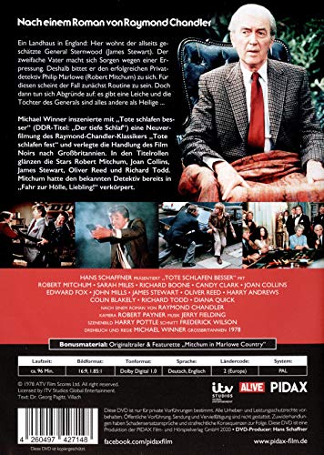 Ein Landhaus in England: Hier wohnt der allseits geschätzte General Sternwood (James Stewart). Der zweifache Vater macht sich Sorgen wegen einer Erpressung. Deshalb bittet er den erfolgreichen Privatdetektiv Philip Marlowe (Robert Mitchum) zu sich. Für diesen scheint der Fall zunächst Routine zu sein. Doch dann tun sich Abgründe auf: es gibt eine Leiche und die Töchter des Generals sind alles andere als Heilige ... Michael Winner inszenierte mit "Tote schlafen besser" (DDR-Titel: "Der tiefe Schlaf") eine Neuverfilmung des Raymond-Chandler-Klassikers "Tote schlafen fest" und verlegte die Handlung des Film Noirs nach Grossbritannien. In den Titelrollen glänzen die Stars Robert Mitchum, Joan Collins, James Stewart, Oliver Reed und Richard Todd. Mitchum hatte den bekannten Detektiv bereits in "Fahr zur Hölle, Liebling!" verkörpert.