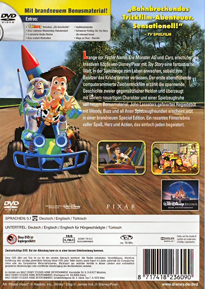 Lange vor Findet Nemo, Die Monster AG und Cars, erschufen die kreativen Köpfe von Disney/Pixar mit Toy Story eine fantastische Welt, in der Spielzeuge zum Leben erwachen, sobald ihre Besitzer das Kinderzimmer verlassen. Der erste abendfüllende computeranimierte Zeichentrickfilm erzählt die spannende Geschichte zweier gegensätzlicher Helden und überzeugt mit seinem neuartigen Charakter und einer Spielzeugtruhe voll neuem Bonusmaterial. John Lasseters gefeiertes Regiedebüt mit Woody, Buzz und all ihren Spielzeugfreunden erscheint jetzt in einer brandneuen Special Edition. Ein rasantes Filmerlebnis voller Spass, Herz und Action, das einfach jeden begeistert.