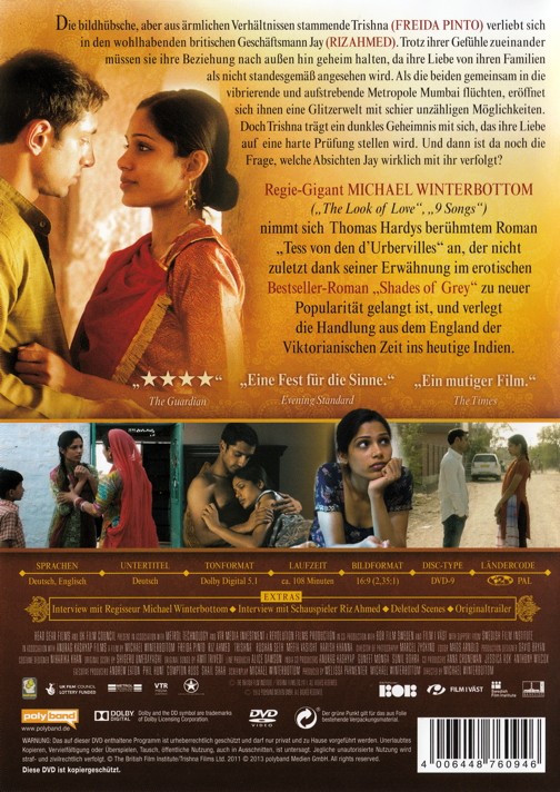 Die bildhübsche, aber aus ärmlichen Verhältnissen stammende Trishna (Freida Pinto, „Slumdog Millionär“) verliebt sich in den wohlhabenden britischen Geschäftsmann Jay (Riz Ahmed, „Four Lions“). Trotz ihrer Gefühle zueinander müssen sie ihre Beziehung nach außen hin geheim halten, da ihre Liebe von ihren Familien als nicht standesgemäß angesehen wird. Als die beiden gemeinsam in die vibrierende und aufstrebende Metropole Mumbai flüchten, eröffnet sich ihnen eine Glitzerwelt mit schier unzähligen Möglichkeiten. Doch Trishna trägt ein dunkles Geheimnis mit sich, dass ihre Liebe auf eine harte Prüfung stellen wird. Und dann ist da noch die Frage, welche Absichten Jay wirklich mit ihr verfolgt? Regie-Gigant Michael Winterbottom („The Look of Love“, „9 Songs“) nimmt sich Thomas Hardys berühmtem Roman „Tess von den d’Urbervilles“ an, der nicht zuletzt dank seiner Erwähnung im erotischen Bestseller-Roman „Shades of Grey“ zu neuer Popularität gelangt ist, und verlegt die Handlung ins heutige Indien.