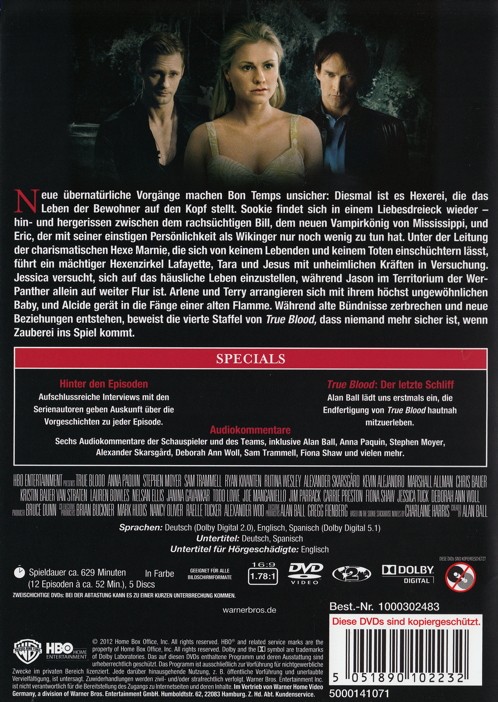 Neue übernatürliche Vorgänge machen Bon Temps unsicher: Diesmal ist es Hexerei, die das Leben der Bewohner auf den Kopf stellt. Sookie findet sich in einem Liebesdreieck wieder – hin- und hergerissen zwischen dem rachsüchtigen Bill, dem neuen Vampirkönig von Mississippi, und Eric, der mit seiner einstigen Persönlichkeit als Wikinger nur noch wenig zu tun hat. Unter der Leitung der charismatischen Hexe Marnie, die sich von keinem Lebenden und keinem Toten einschüchtern lässt, führt ein mächtiger Hexenzirkel Lafayette, Tara und Jesus mit unheimlichen Kräften in Versuchung. Jessica versucht sich auf das häusliche Leben einzustellen, während Jason im Territorium der Wer-Panther allein auf weiter Flur ist. Arlene und Terry arrangieren sich mit ihrem höchst ungewöhnlichen Baby, und Alcide gerät in die Fänge einer alten Flamme. Während alte Bündnisse zerbrechen und neue Beziehungen entstehen, beweist die vierte Staffel von True Blood, dass niemand mehr sicher ist, wenn Zauberei ins Spiel kommt.