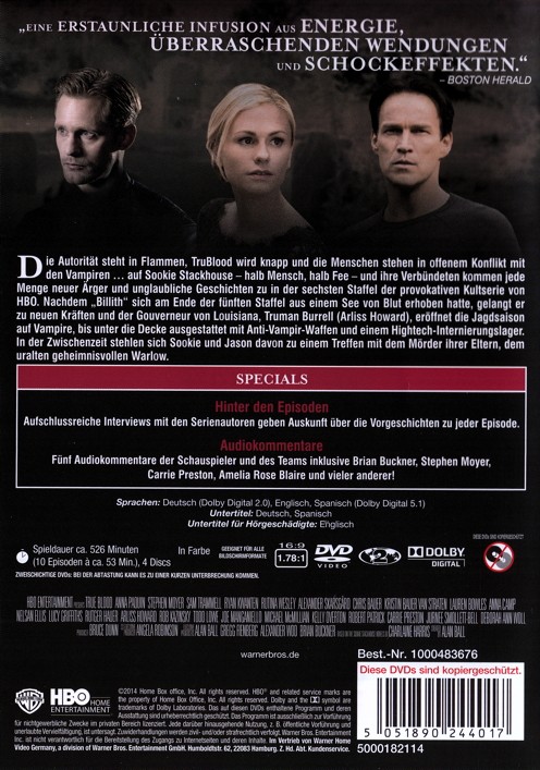 Die Autorität steht in Flammen, True Blood wird knapp und die Menschen stehen in offenem Konflikt mit den Vampiren... auf Sookie Stackhouse - halb Mensch, halb Fee - und ihre Verbündeten kommen jede Menge neuer Ärger und unglaubliche Geschichten zu in der sechsten Staffel der provokativen Kultserie von HBO. Nachdem "Billith" sich am Ende der fünften Staffel aus einem See aus Blut erhoben hatte, gelangt er zu neuen Kräften und der Gouverneur von Louisiana, Truman Burrell, eröffnet die Jagdsaison auf Vampire, bis unter die Decke ausgestattet mit Anti-Vampir-Waffen und einem Hightech-Internierungslager. In der Zwischenzeit stehlen sich Sookie und Jason davon zu einem Treffen mit dem Mörder ihrer Eltern, dem uralten geheimnisvollen Warlow.