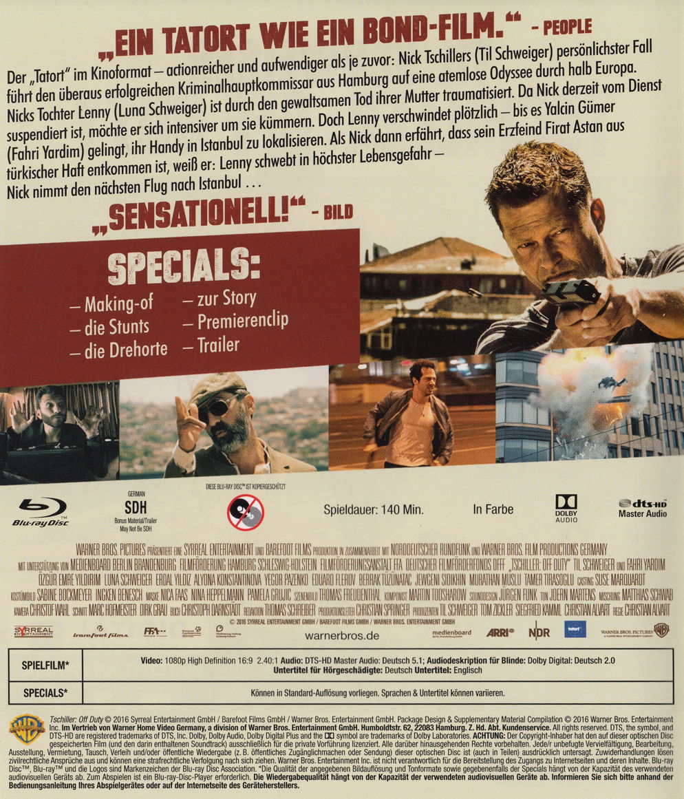 Das actiongeladene Finale der Tatort-Reihe mit Til Schweiger führt den Kommissar ausser Diensten auf eine atemlose Odyssee durch halb Europa! Der Tatort, der es auf die grosse Kinoleinwand geschafft hat actionreicher und aufwendiger als je zuvor: Nick Tschillers persönlichster Fall führt den überaus erfolgreichen Kriminalhauptkommissar aus Hamburg auf eine atemlose Odyssee durch halb Europa. Zwei quotenstarke NDR-Einsätze hatte das unschlagbare Ermittler-Duo Tschiller und Gümer bereits hinter sich (Willkommen in Hamburg, Kopfgeld) als Anfang 2016 zwei weitere Tatort-Episoden mit den beiden im Fernsehen ausgestrahlt wurden: Der grosse Schmerz und Fegefeuer. Sie bilden die inhaltliche Voraussetzung für den Kinofilm Tschiller: Off Duty doch dessen Handlung ist trotzdem in sich geschlossen und wird auch von jedem Zuschauer verstanden, der die TV-Filme nicht gesehen hat.