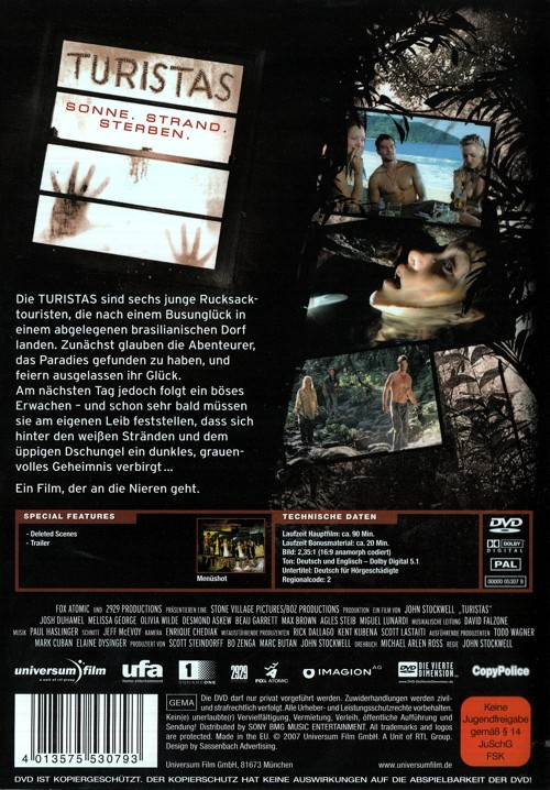Sonne. Strand. Sterben. Die TURISTAS sind sechs junge Rucksacktouristen, die nach einem Busunglück in einem abgelegenen brasilianischen Dorf landen. Zunächst glauben die Abenteurer, das Paradies gefunden zu haben, und feiern ausgelassen ihr Glück. Am nächsten Tag jedoch folgt ein böses Erwachen - und schon sehr bald müssen sie am eigenen Leib feststellen, dass sich hinter den weissen Stränden und dem üppigen Dschungel ein dunkles, grauenvolles Geheimnis verbirgt... Ein Film der an die Nieren geht!