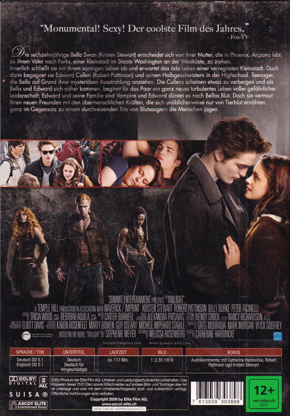 Stephenie Meyer erzählt in ihrem Bestseller 'Bis(s) zum Morgengrauen' (Originaltitel: 'Twilight') die Geschichte einer verbotenen, aber faszinierenden Liebe - und begeisterte damit Millionen von Lesern auf der ganzen Welt. Auch in Deutschland ist die 'Bis(s)...' Reihe ein grosser Erfolg: Die ersten drei der bisher vier Bände wurden mehr als 900.000 Mal verkauft. Ihre weltweite Popularität hat sich auch in über 350 Twilight-Internet-Fanseiten niedergeschlagen. Regisseurin Catherine Hardwicke, bereits in 'Dreizehn' und 'Dogtown Boys'einfühlsame Beobachterin der verwirrenden Gefühlswelt von Teenagern, bringt die aussergewöhnliche Geschichte um Bella und Edward als eine packende und zugleich romantische Mischung aus Horror, Fantasy und Lovestory auf die grosse Leinwand. Die jungen Hauptdarsteller Kristen Stewart (siehe 'Panic Room' und 'Into the Wild' ) und Robert Pattinson (aus 'Harry Potter und der Feuerkelch') verkörpern ausdrucksstark und überzeugend das ungewöhnliche Liebespaar und zählen inzwischen zu den heissesten Jungstars Hollywoods.