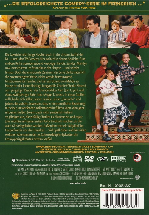 Die (zweieinhalb) Jungs klopfen auch in der dritten Staffel der Nr. 1 unter den TV-Comedy-Hits weiterhin clevere Sprüche. Eine endlose Reihe atemberaubend knackiger Kandis, Sandys, Mandys usw. marschieren ins Strandhaus der Harpers und wieder hinaus. Doch das emotionale Zentrum der Serie bleibt natürlich die zusammengewürfelte, nicht gerade hervorragend funktionierende Familie, die hier am Strand von Malibu zu Hause ist: der locker-flockige Junggeselle Charlie, sein pingeliger Bruder, der Chiropraktiker Alan, und Alans zwölfjähriger Sohn Jake.