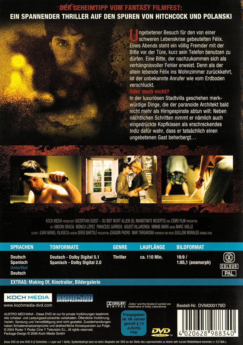 Der wohlhabende Architekt Félix befindet sich nach der Trennung von seiner Freundin in einer schweren Lebenskrise. Bis eines Abends ein mysteriöser Fremder vor seiner Türe steht und ihn bittet, sein Telefon zu benutzen. Félix gewährt dem Fremden Einlass und zieht sich während des Telefonats in ein Nebenzimmer zurück. Als er ins Wohnzimmer zurückkehrt, scheint der Mann wie vom Erdboden verschluckt. Anfangs hält er es nur für Gehirngespinste, doch nach und nach geschehen merkwürdige Dinge in seiner luxuriösen Stadtvilla: Nachts hört er Schritte, findet eingedrückte Kopfkissen vor, und alles sieht so aus, als habe er einen ungebetenen Gast... Der Geheimtipp vom Fantasy Filmfest 2005: Ein ungemein spannender Thriller auf den Spuren von Hitchcock und Polanski.