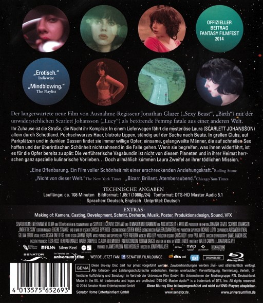 Ihr Zuhause ist die Strasse, die Nacht ihr Komplize: In einem Lieferwagen fährt die mysteriöse Laura (SCARLETT JOHANSSON) allein durch Schottland. Pechschwarzes Haar, blutrote Lippen, ständig auf der Suche nach Beute. In grellen Clubs, auf Parkplätzen und in dunklen Gassen findet sie immer willige Opfer; einsame, gelangweilte Männer, die auf schnellen Sex hoffen und der überirdischen Schönheit nichtsahnend in die Falle gehen. Wenn sie begreifen, was ihnen widerfährt, ist es für die Opfer bereits zu spät: Die verführerische Vagabundin ist nicht von diesem Planeten, und in ihrer Heimat herrschen ganz spezielle kulinarische Vorlieben… Doch allmählich kommen Laura Zweifel an ihrer tödlichen Mission.