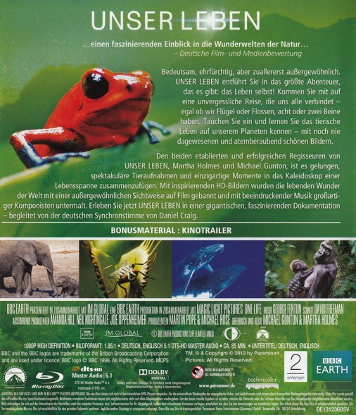 Den beiden etablierten und erfolgreichen Regisseuren von UNSER LEBEN, Martha Holmes und Michael Gunton, ist es gelungen, spektakuläre Tieraufnahmen und einzigartige Momente in das Kaleidoskop einer Lebensspanne zusammenzufügen. Mit inspirierenden HD-Bildern wurden die lebenden Wunder der Welt mit einer außergewöhnlichen Sichtweise auf Film gebannt und mit beeindruckender Musik großartiger Komponisten untermalt. Erleben Sie jetzt UNSER LEBEN in einer gigantischen, faszinierenden Dokumentation – begleitet von der deutschen Synchronstimme von Daniel Craig.