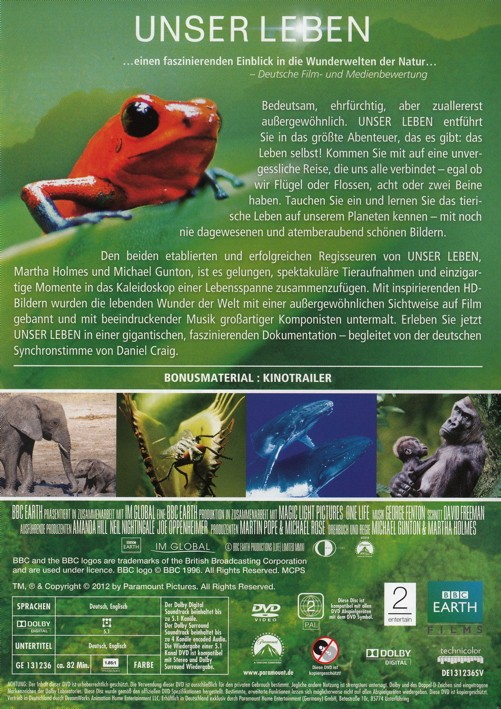 Den beiden etablierten und erfolgreichen Regisseuren von UNSER LEBEN, Martha Holmes und Michael Gunton, ist es gelungen, spektakuläre Tieraufnahmen und einzigartige Momente in das Kaleidoskop einer Lebensspanne zusammenzufügen. Mit inspirierenden HD-Bildern wurden die lebenden Wunder der Welt mit einer außergewöhnlichen Sichtweise auf Film gebannt und mit beeindruckender Musik großartiger Komponisten untermalt. Erleben Sie jetzt UNSER LEBEN in einer gigantischen, faszinierenden Dokumentation – begleitet von der deutschen Synchronstimme von Daniel Craig.