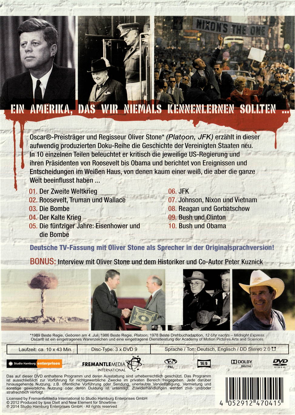 Oscar®-Preisträger und Regisseur Oliver Stone erzählt in dieser aufwendig produzierten Doku-Reihe die Geschichte der Vereinigten Staaten neu. In 10 einzelnen Teilen beleuchtet er kritisch die jeweilige US-Regierung und ihren Präsidenten von Roosevelt bis Obama.