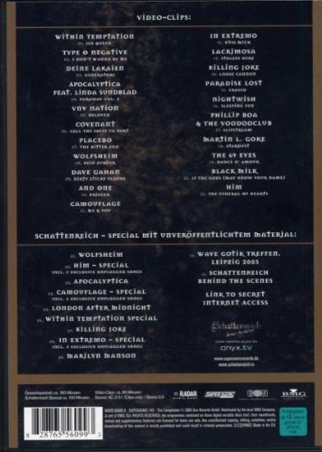 Aus dem Stand wurde Schattenreich- das Sonic Seducer Magazin zum meistgesehenen Format für die musikalischen Strömungen zwischen Goth, Rock und Elektro. Und passend zu diesem TV Erfolg veröffentlicht GUN Records jetzt die Compilation Schattenreich auf DVD und CD. Genauso wie sich in der TV Sendung das Who ist Who wie z. B. Marilyn Manson & HIM die Klinke in die Hand geben, geschieht es auf dieser Compilation. Die Doppel CD bietet über 2 Stunden erstklassige Unterhaltung. Hier sind unter anderem zu nennen HIM, mit Funeral OF Hearts, Wolfsheim - Kein Zurück, In Extremo Küss Mich, Dave Gahan - Dirty Sticky Floors und viele mehr. Und die dazugehörige DVD aht auch noch einiges mehr zu bieten. Neben den Hit Single Clips von HIM, Within Temptation, Wolfsheim, In Extremo, Laibach usw, findet man hier noch über 70 Minuten exklusives Material, wie unveröffentlichte Unplugged Songs von HIM, In Extremo & Camouflage. Ausserdem noch exklusives Interview Material von Within Temptation, Marilyn Manson und Wolfsheim, welches die Herzen höher schlagen lässt. Alles in allem bietet diese Comilation eine Zusammenstellung aus Grossen Hits, Klassikern und exklusivem Interview- und Songmaterial!