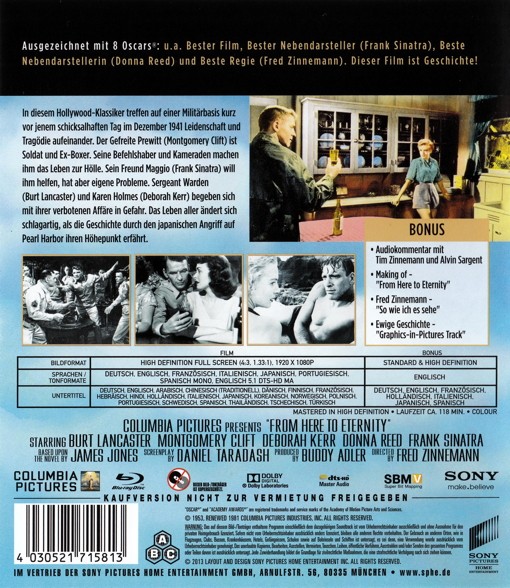 Der unvergleichliche Hollywood-Klassiker. Mit Montgomery Clift, Burt Lancaster und Frank Sinatra. Ausgezeichnet mit 8 Oscars u.a. Bester Film, Bester Nebendarsteller Frank Sinatra, Beste Nebendarstellerin Donna Reed und Beste Regie Fred Zinnemann. Dieser Film ist Geschichte!