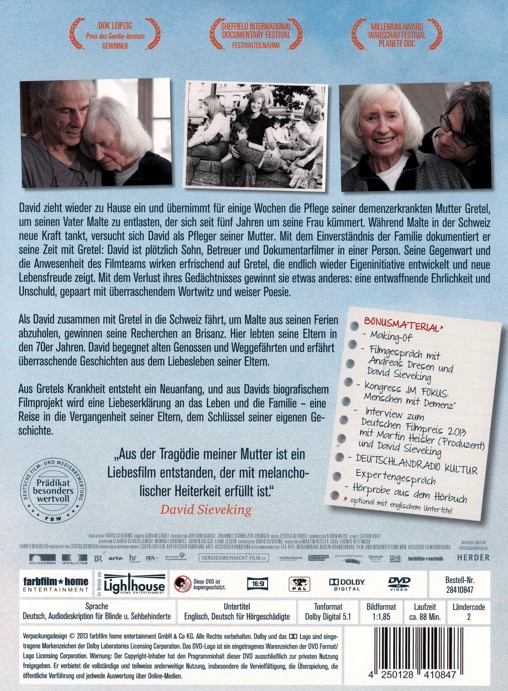 David zieht wieder zu Hause ein und übernimmt für einige Wochen die Pflege seiner demenzerkrankten Mutter Gretel, um seinen Vater Malte zu entlasten, der sich seit seiner Pension vor fünf Jahren um seine Frau kümmert. Während Malte in der Schweiz für ein paar Wochen neue Kraft tankt, versucht sich David als Pfleger seiner Mutter. Mit dem Einverständnis der Familie dokumentiert er seine Zeit mit Gretel: David ist plötzlich Sohn, Betreuer und Dokumentarfilmer in einer Person. Seine Gegenwart und die Anwesenheit des Filmteams wirken erfrischend auf die Mutter, die endlich wieder Eigeninitiative entwickelt und neue Lebensfreude zeigt. Trotz ihrer zeitlich wie örtlichen Orientierungslosigkeit bleibt Gretel heiter und gelassen: Sie hält sich für eine junge Frau und David für ihren Mann Malte.