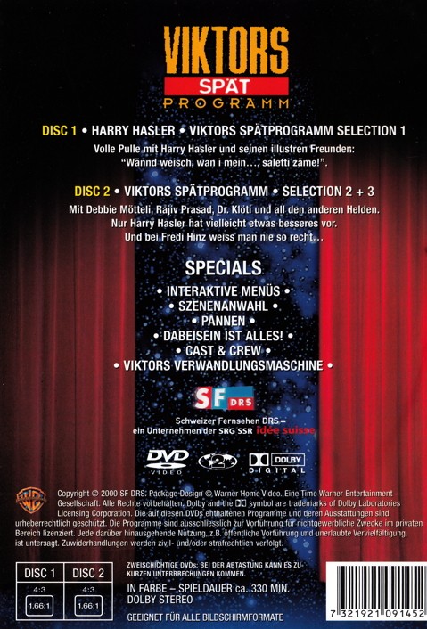 Viktors Spätprogramm Selektion 2+3 (Mit Debbie Mötteli, Rajiv Prasad, Dr. Klöti und all den anderen Helden. Nur Harry Hasler hat vielleicht etwas besseres vor. Und bei Fredi Hinz weiss man nie so recht...) Special Features: * Interaktive Menüs * Pannen * Dabeisein ist alles * Cast & Crew * Viktors Verwandlungsmaschine