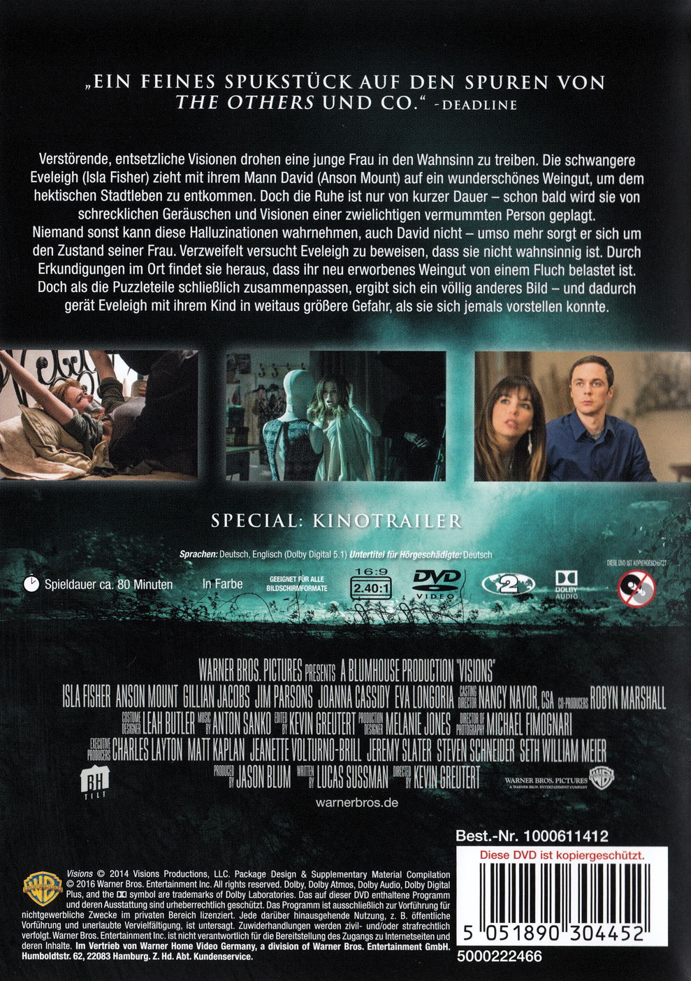 Isla Fisher, Eva Longoria, Anson Mount, Jim Parsons und Gillian Jacobs spielen die Hauptprollen im Supernatural-Thriller Visions, in dem verstörende, entsetzliche Visionen eine junge Frau in den Wahnsinn zu treiben drohen. Die schwangere Eveleigh zieht mit ihrem Mann David auf ein wunderschönes Weingut, um dem hektischen Stadtleben zu entkommen. Doch die Ruhe ist nur von kurzer Dauer - schon bald wird sie von schrecklichen Geräuschen und Visionen einer zwielichtigen vermummten Person geplagt. Niemand sonst kann diese Halluzinationen wahrnehmen, auch David nicht - umso mehr sorgt er sich um den Zustand seiner Frau. Verzweifelt versucht Eveleigh zu beweisen, dass sie nicht wahnsinnig ist. Durch Erkundigungen im Ort findet sie heraus, dass ihr neu erworbenes Weingut von einem Fluch belastet ist. Doch als die Puzzle-Teile schliesslich zusammenpassen, ergibt sich ein völlig anderes Bild - und dadurch gerät Eveleigh mit ihrem Kind in weitaus grössere Gefahr, als sie sich jemals vorstellen konnte.
