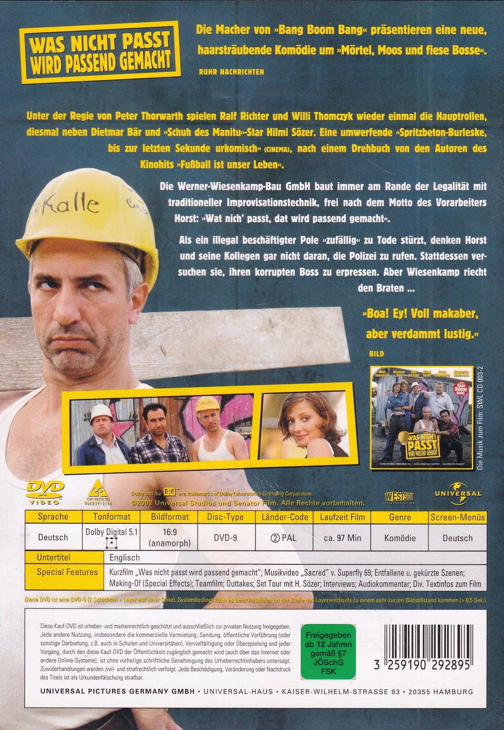 Wenn der Grundriss eines Hauses nicht mehr stimmt, eine Fliegerbombe aus dem Zweiten Weltkrieg im Weg liegt oder ein toter polnischer Schwarzarbeiter nicht in das Loch im Rohbau passen will... dann wird es eben passend gemacht! Kleinere Probleme löst der lausig-liebenswerte Bautrupp um Polier Horst (Willi Thomczyk), Weiberheld Kalle (Ralf Richter) und Familienmensch Kümmel (Hilmi Sözer) im Handumdrehen. Ärgerlich wird es erst, als ihnen ihr Boss, der wieder einmal mit den Lohnzahlungen im Verzug ist, den schnöseligen Architektur-Studenten Philipp (Peter Thorwarth) als Handlanger aufs Auge drückt. Philipp glänzt nicht nur durch zwei linke Hände, er baggert auch noch Horsts hübsche Tochter Astrid (Alexandra Maria Lara) an. Gut, dass der Vorarbeiter weiss, wie man mit solchen Typen umgehen muss - wer nicht passt, wird eben passend gemacht.