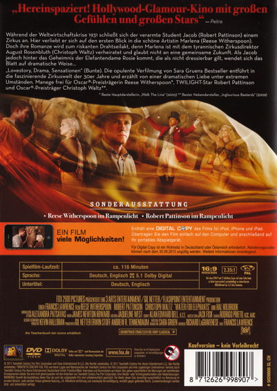 Während der Weltwirtschaftskrise 1931 schliesst sich der verarmte Student Jacob (Robert Pattinson) einem Zirkus an. Hier verliebt er sich auf den ersten Blick in die schöne Kunstreiterin Marlena (Reese Witherspoon). Doch ihre Romanze wird zum riskanten Drahtseilakt, denn Marlena ist mit dem tyrannischen Zirkusdirektor August Rosenbluth (Christoph Waltz) verheiratet und glaubt nicht an eine gemeinsame Zukunft. Als Jacob jedoch hinter das Geheimnis der Elefantendame Rosie kommt, die als nicht dressierbar gilt, wendet sich das Blatt auf dramatische Weise...