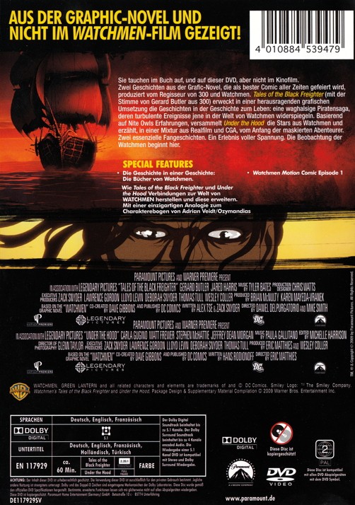 Sie tauchen im Buch auf, und auf dieser DVD, aber nicht im Kinofilm: Zwei Geschichten aus der Grafic-Novel, die als bester Comic aller Zeiten gefeiert wird, produziert vom Regisseur von 300 und Watchmen. 'Tales Of The Black Freighter' (mit der Stimme von Gerard Butler aus 300) erweckt in einer herausragenden grafischen Umsetzung dieser Geschichten in der Geschichte zum Leben: eine waghalsige Piratensaga, deren turbulente Ereignisse jene in der Welt von Watchmen widerspiegeln. Basierend auf Nite Owls Erfahrungen, versammelt 'Under The Hood' die Stars aus Watchmen und erzählt, in einer Mixtur aus Realfilm und CGA, vom Anfang der maskierten Abenteurer. Zwei essenzielle Fangeschichten. Ein Erlebnis voller Spannung. Die Beobachtung der Watchmen beginnt hier.