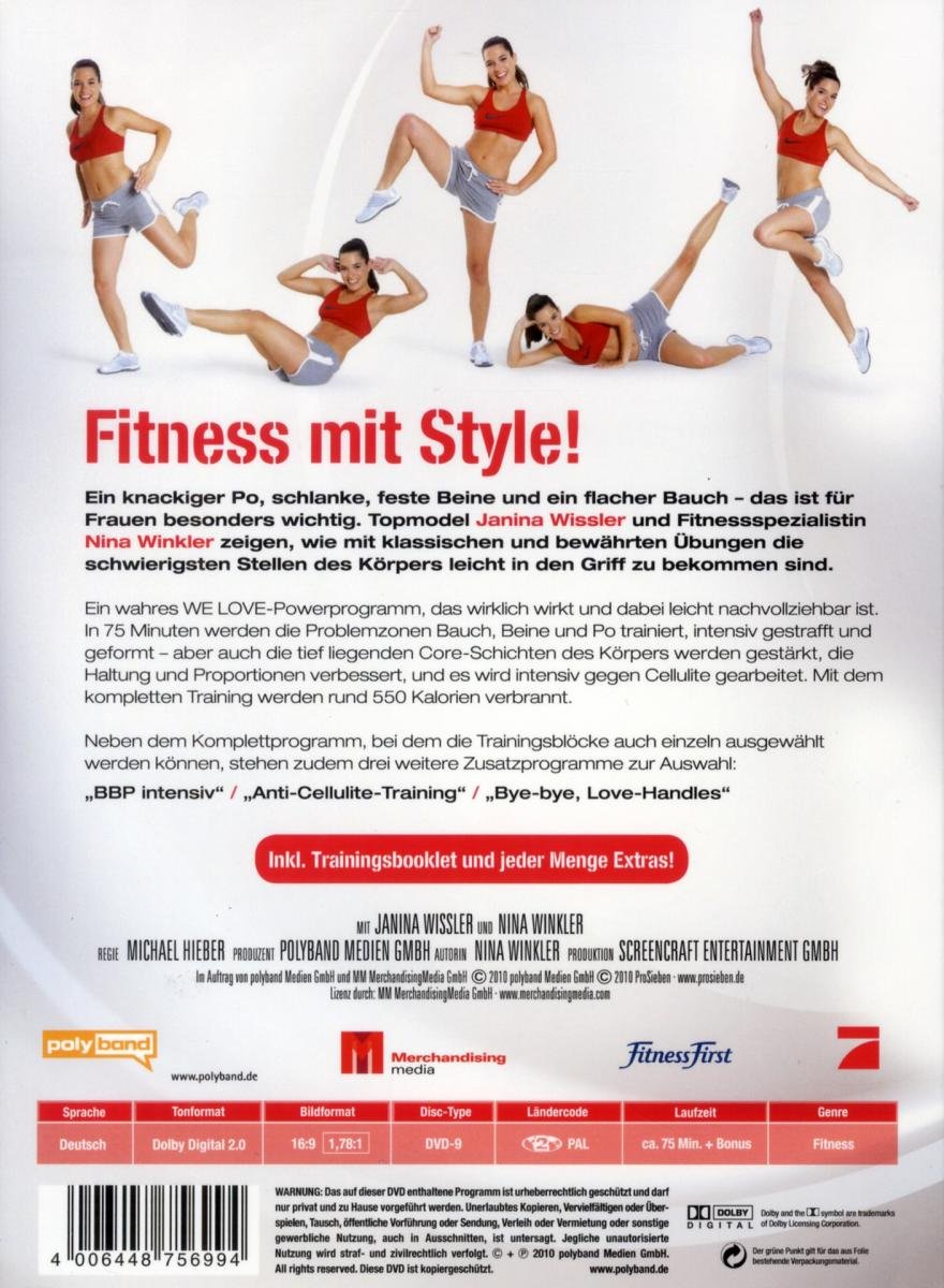 Ein wahres WE LOVE-Powerprogramm, das wirklich wirkt und dabei leicht nachvollziehbar ist. In 75 Minuten werden die Problemzonen Bauch, Beine und Po trainiert, intensiv gestrafft und geformt – aber auch die tief liegenden Core-Schichten des Körpers werden gestärkt, die Haltung und Proportionen verbessert, und es wird intensiv gegen Cellulite gearbeitet. Mit dem kompletten Training verbrennt man rund 550 Kalorien. Neben dem Komplettprogramm, bei dem die jeweiligen Trainingsblöcke auch einzeln ausgewählt werden können, stehen zudem drei weitere Zusatzprogramme zur Auswahl: „BBP intensiv“ / „Anti-Cellulite-Training“ / „Bye-bye, Love-Handles“
