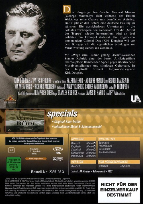 Kirk Douglas, Richard Anderson, Joe Turkel, Adolphe Menjou, Ralph Meeker, George Macready, Wayne Morris, Christiane Kubrick, Jerry Hausner, Peter Capell...Emile Meyer, Bert Freed, Kem Dibbs, Timothy Carey, Fred Bell