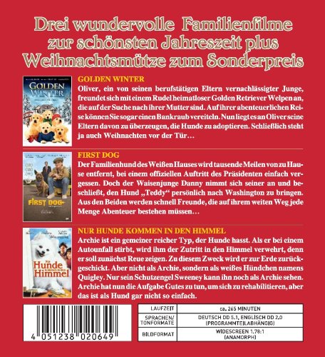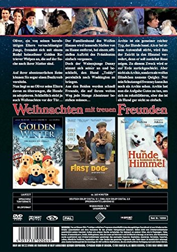 3 TOP FILME = 1 TOP PREIS! - Drei wunderbare Weihnachtsfilme für die ganze Familie. INHALT: Golden Winter: Oliver, ein von seinen berufstätigen Eltern vernachlässigter Junge, freundet sich mit einem Rudel heimatloser Golden Retriever Welpen an, die auf der Suche nach ihrer Mutter sind. Auf ihrer abenteuerlichen Reise können Sie sogar einen Bankraub vereiteln. Nun liegt es an Oliver seine Eltern davon zu überzeugen, die Hunde zu adoptieren. Schliesslich steht ja auch Weihnachten vor der Tür...First Dog: Der Familienhund des Weissen Hauses wird tausende Meilen von zu Hause entfernt, bei einem offiziellen Auftritt des Präsidenten einfach vergessen. Doch der Waisenjunge Danny nimmt sich seiner an und beschliesst, den Hund Teddy persönlich nach Washington zu bringen. Aus den Beiden werden schnell Freunde, die auf ihrem weiten Weg jede Menge Abenteuer bestehen müssen...Nur Hunde kommen in den Himmel: Archie ist ein gemeiner reicher Typ, der Hunde hasst. Als er bei einem Autounfall stirbt, wird ihm der Zutritt in den Himmel verwehrt, denn er soll zunächst Reue zeigen. Zu diesem Zweck wird er zur Erde zurückgeschickt. Aber nicht als Archie, sondern als weisses Hündchen namens Quigley. Nur sein Schutzengel Sweeney kann ihn noch als Archie sehen. Archie hat nun die Aufgabe Gutes zu tun, um sich zu rehabilitieren, aber das ist als Hund gar nicht so einfach.