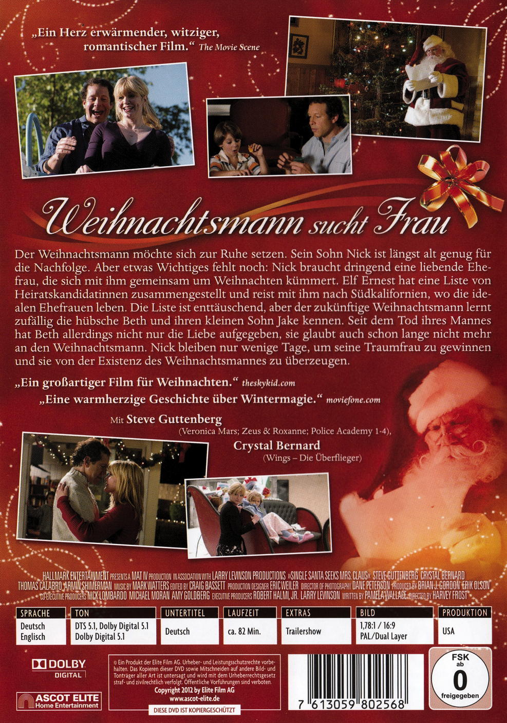 'Weihnachtsmann sucht Frau', pure Romantik und Weihnachtsmagie verbindet diese wundervolle Comedy um den Weihnachtsmann auf der Suche nach seiner Traumfrau. Mit fröhlichem 'Hohoho' gepaart mit einem Hauch von kindlicher Naivität überzeugt 'Police Academy' Komiker Steve Guttenberg als verliebter Weihnachtsmann seine Traumfrau und die Zuschauer. Die sommerliche Sonne Kaliforniens und dazu ein guter Schuss weihnachtlicher Magie machen aus 'Weihnachtsmann sucht Frau' vollends eine warmherzige und unterhaltsame Alternative zu den alt bekannten Weihnachtsmärchen mit Schnee und Tannenduft. Ein Vergnügen für alle, die sich ein sonniges Herz für den Weihnachtsmann bewahrt haben.