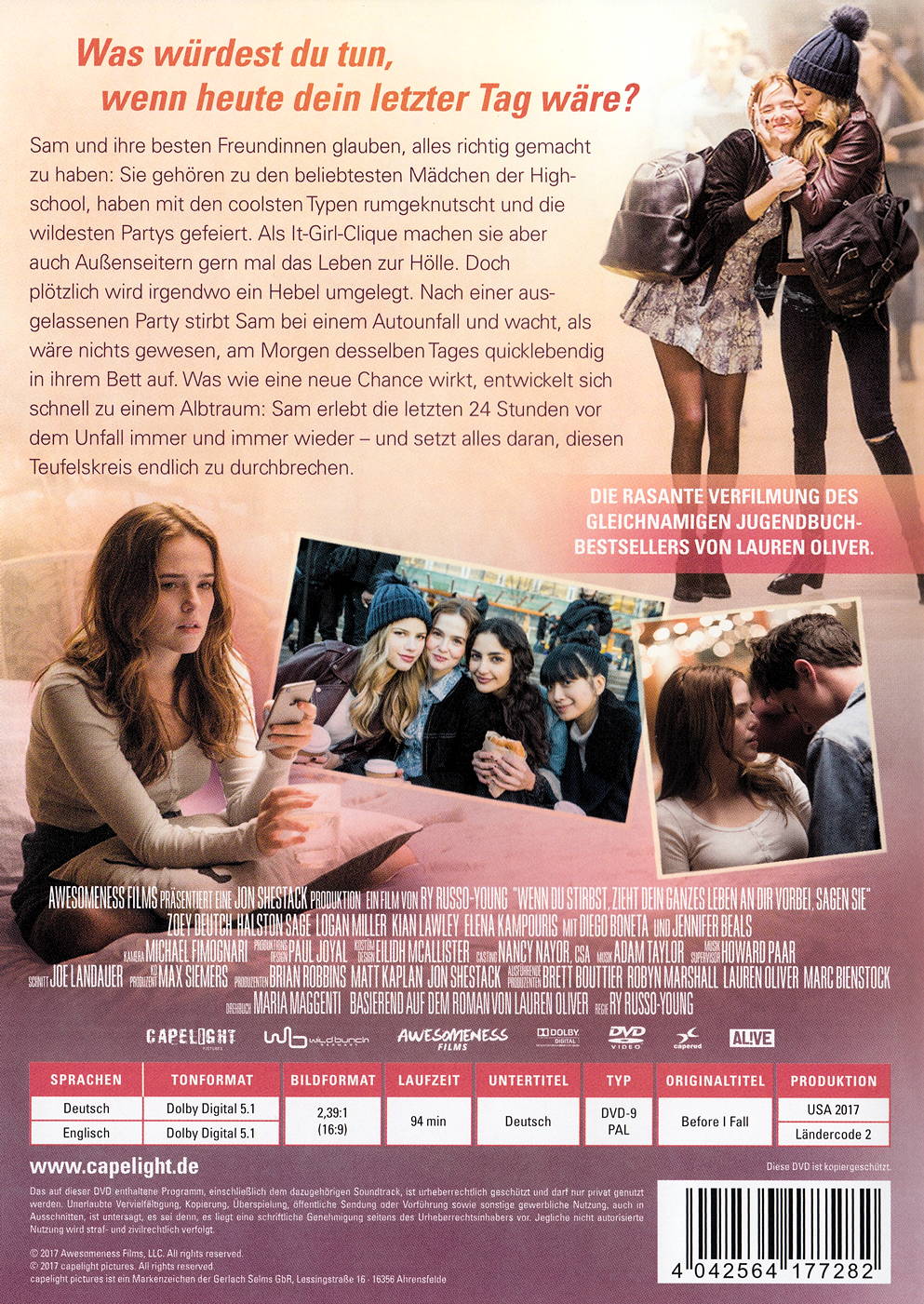 Was würdest du tun, wenn heute dein letzter Tag wäre? Sam und ihre besten Freundinnen glauben, alles richtig gemacht zu haben: sie gehören zu den beliebtesten Mädchen der Highschool, haben mit den coolsten Typen geknutscht und die wildesten Partys gefeiert. Als It-Girl-Clique machen sie aber auch Aussenseitern gern mal das Leben zur Hölle. Die vier Freundinnen haben die Schule fest im Griff und sehen sehr gut dabei aus. Doch plötzlich wird irgendwo ein Hebel umgelegt und die Regeln der perfekten Highschool-Welt ändern sich. Nach einer ausgelassenen Party stirbt Sam bei einem Autounfall - doch als wäre nichts gewesen, wacht sie am Morgen desselben Tages quicklebendig in ihrem Bett auf. Was wie eine neue Chance wirkt, entwickelt sich schnell zu einem Albtraum: Sam erlebt die letzten 24 Stunden vor dem Unfall immer und immer wieder - und setzt alles daran, diesen Teufelskreis endlich zu durchbrechen.