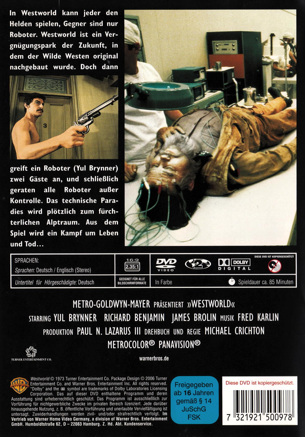Im Themenpark namens Westworld dürfen die Urlauber für 1000 Dollar pro Tag jede ihrer Launen und Vorlieben ausleben. Sie können eine Bar zu Kleinholz zerlegen, aus dem Knast ausbrechen, ein Bordell besuchen oder schneller ziehen als die Revolverhelden. Alles ohne Risiko: Die lebensechten Androiden im Park sind so programmiert, dass sie keinem Besucher etwas zuleide tun. Doch nicht bei allen Robotern funktioniert das Programm einwandfrei. Michael Crichton schrieb selbst das Drehbuch zu seinem Regiedebüt. Der futuristische Thriller war auch technisch zukunftsweisend - erstmals wurden in einem Spielfi lm digitale Bilder verwendet. Richard Benjamin und James Brolin spielen zwei Freunde, die ihren Spass in der simulierten Realität suchen, als die plötzlich tatsächlich Wirklichkeit wird. Und Yul Brynner verkörpert ihren mechanischen Erzfeind, der sie sporenklirrend und unerbittlich verfolgt. Jetzt heisst es: Mensch gegen Maschine - in einer Zukunft, in der nicht genug Platz für beide ist.