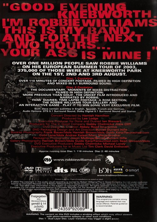 Over One Million People Saw Robbie Williams On His European Summer Tour Of 2003, 375,000 Of Those Were At Knebworth Park On the 1st, 2nd and 3rd August.
