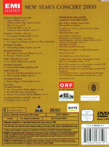 Neben dem Mitschnitt des Neujahrskonzerts gibt diese DVD zudem ausführliche Informationen über das Orchester und den italienischen Stardirigenten Riccardo Muti sowie über die Tradition des legendären Wiener Neujahrskonzerts. 1. Lagunen-Walzer op. 411 - Johann Strauss 2. Hellenen-Polka op. 203 - Johann Strauss 3. Albion-Polka op. 102 - Johann Strauss 4. Liebeslieder-Walzer op. 114 - Johann Strauss 5. Csárdás aus "Ritter Pasman" op. 441-1 - Johann Strauss 6. Mit Extrapost op. 259 - Eduard Strauss 7. Ein Morgen, ein Mittag, ein Abend in Wien - von Franz Suppé 8. Gruß an Prag op. 144 - Eduard Strauss 9. Wein, Weib und Gesang op. 333 - Johann Strauss 10. Persischer Marsch op. 289 - Johann Strauss 11. Die Libelle op. 204 - Josef Strauss 12. Process-Polka op. 294 - Johann Strauss 13. Künstler-Gruß op. 274 - Josef Strauss 14. Marien-Klänge op. 214 - Josef Strauss 15. Éljen a Magyar! op. 332 - Johann Strauss 16. Vom Donaustrande op. 356 - Johann Strauss 17. Riccardo Muti's New Year Greeting - Johann Strauss 18. An der schönen blauen Donau op. 314 - Johann Strauss 19. Radetzky-Marsch op. 228 - Johann Strauss (Vater)