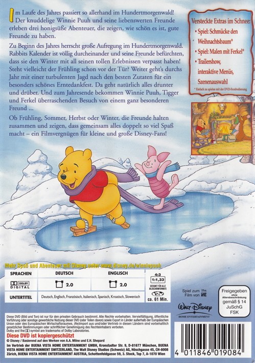 Lustige Jahreszeiten im HundertmorgenwaldIm Laufe des Jahres passiert so allerhand im Hundertmorgenwald! Der knuddelige Winnie Puuh und seine liebenswerten Freunde erleben drei honigsüsse Abenteuer, die zeigen, wie schön es ist, gute Freunde zu haben. Zu Beginn des Jahres herrscht grosse Aufregung im Hundertmorgenwald. Rabbits Kalender ist völlig durcheinander und seine Freunde befürchten, dass sie den Winter mit all seinen tollen Erlebnissen verpasst haben! Steht vielleicht der Frühling vor der Tür? Weiter geht es durchs Jahr mit einer turbulenten Jagd nach den besten Zutaten für ein besonders schönes Erntedankfest. Da geht natürlich alles drunter und drüber. Und zum Jahresende bekommen Winnie Puuh, Tigger und Ferkel überraschenden Besuch von einem ganz besonderen Freund...