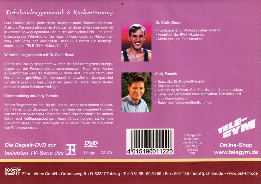 Laut Statistik leidet jeder Dritte Deutsche unter Rückenschmerzen. Ärzte und Wissenschaftler sehen die Ursachen dieser Zivilisationskrankheit in unserer Bewegungsarmut und in der alltäglichen Fehl- und Überbelastung der Wirbelsäule. Nur regelmässiges, gezieltes Rückentraining kann vorbeugen und helfen. Für die Wirbelsäulengymnastik mit Dr. Carlo Bussi wurden die fünf wichtigsten Übungsfolgen aus der Fernsehserie zusammengestellt. Nach einer kurzen Aufwärmphase wird die Wirbelsäule mobilisiert und der Stütz- und Halteapparat gekräftigt. Die therapeutisch bewährten Übungen sind für alle Alters- und Leistungsstufen geeignet, soweit keine akuten orthopädischen Schäden vorliegen. Das Rückentraining mit Andy Fumolo ist ideal für alle, die viel sitzen oder stehen müssen. Fünf 13-minütige Übungseinheiten trainieren den gesamten Rücken, von der Lendenwirbelsäule bis hinauf zur Halswirbelsäule. Die sanften Dehn- und Kräftigungsübungen lösen Verspannungen, stärken die Rückenmuskulatur und beseitigen so in vielen Fällen die Ursachen von Rückenschmerzen.