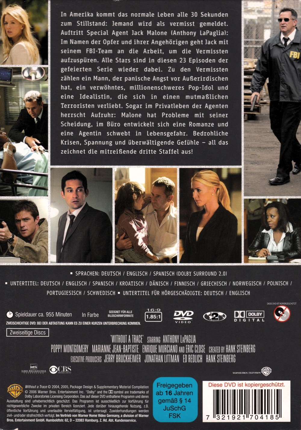 In Amerika kommt das normale Leben alle 30 Sekunden zum Stillstand Jemand wird als vermisst gemeldet. Auftritt Special Agent Jack Malone. seinem FBI-Team an die Arbeit, um die Vermissten aufzuspren. Alle Stars sind in diesen 23 Episoden der gefeierten Serie wieder dabei. Zu den Vermissten zhlen ein Mann , der panische Angst vor Auerirdischen hat, ein verwhntes , millionenschweres Pop-Idol und eine Idealistin, die sich in einen mutmalichen Terroristen verliebt. Sogar im Privatleben der Agenten herrscht Aufruhr Malone hat Probleme mit seiner Scheidung, im Bro entwickelt sich eine Romanze und eine Agentin schwebt in Lebensgefahr. Bedrohliche Krisen, Spannung und berwltigende Gefhle all das zeichnet die mitreiende dritte Staffel aus!