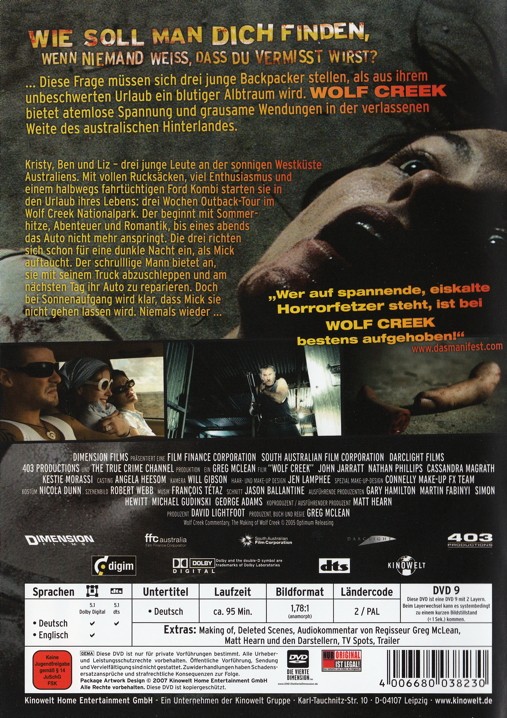 Kristy, Ben und Liz - drei junge Leute an der sonnigen Westküste Australiens. Mit vollen Rucksäcken, viel Enthusiasmus und einem halbwegs fahrtüchtigen Ford Kombi starten sie in den Urlaub ihres Lebens: drei Wochen Outback-Tour im Wolf Creek Nationalpark. Der beginnt mit Sommerhitze, Abenteuer und Romantik, bis eines abends das Auto nicht mehr anspringt. Die drei richten sich schon für eine dunkle Nacht ein, als Mick auftaucht. Der schrullige Mann bietet an, sie mit seinem Truck abzuschleppen und am nächsten Tag ihr Auto zu reparieren. Doch bei Sonnenaufgang wird klar, dass Mick sie nicht gehen lassen will. Niemals wieder.