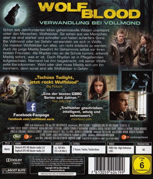 Spannung, Action und eine wohlige Portion Gänsehaut verspricht die neue Sensationsserie für Kinder und Jugendliche aus UK. Die britisch-deutsche Coproduktion von BBC und ZDF, unterstützt von der Münchner Effectsschmiede Trixter (X-Men: First Class; Green Lantern), kann nach der Erstausstrahlung auf CBBC eine große Fangemeinde vorweisen, die bereits der zweiten Staffel entgegen fiebert. Ideengeberin und Autorin Debbie Moon und ihren Kollegen ist es gelungen, spannende Fantasy-Action um zwei Teenager, die halb Mensch, halb Wolf sind, mit den alltäglichen Hochs und Tiefs des Erwachsenwerdens zu verbinden. In den Figuren kann sich jeder jugendliche Zuschauer wiederfinden, auch wenn er weder kilometerweit hören und riechen, noch in der Nacht sehen oder mit Highspeed laufen kann. Nach Ausstrahlungen auf dem KiKa und auf ZDF tivi erscheint die Fantasy-Serie um die zwei jungen Wolfsblüter Maddy und Rhydian nun auf DVD. "Twilight" meets "Schloss Einstein"!