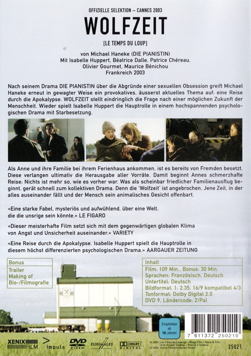Als Anne und ihre Familie in ihrem Ferienhaus ankommen, ist es bereits von Fremden besetzt. Diese verlangen ultimativ die Herausgabe aller Vorräte. Damit beginnt Annes schmerzhafte Reise: Nichts ist mehr, wie es war. Denn die "Wolfzeit" ist angebrochen. Jene Zeit, in der alles aueinander fällt und der Mensch sein animalisches Gesicht offenbart. Was als scheinbar friedlicher Familienausflug beginnt, entwickelt sich zum kollektiven Drama.