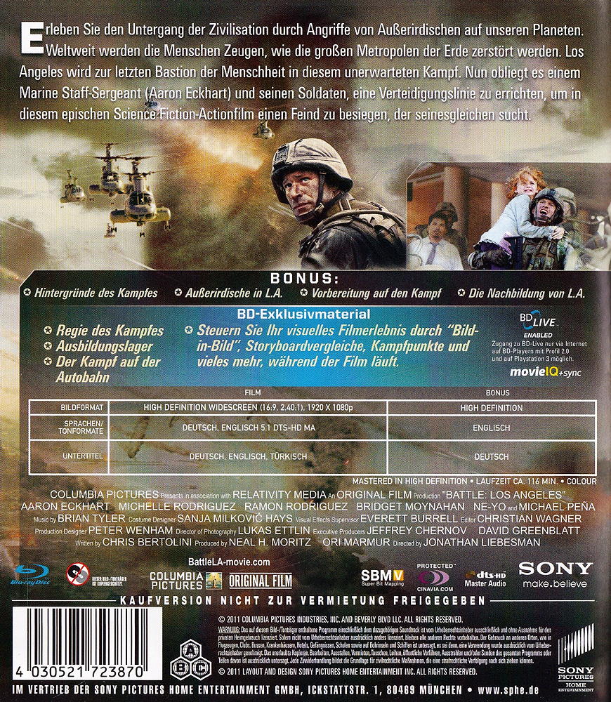 Erleben Sie den Untergang der Zivilisation durch Angriffe von Außerirdischen auf unseren Planeten. Weltweit werden die Menschen Zeugen, wie die großen Metropolen der Erde zerstört werden. Los Angeles wird zur letzten Bastion der Menschheit in diesem unerwarteten Kampf. Nun obliegt es einem Marine Staff-Sergeant (Aaron Eckhart) und seinen Soldaten, eine Verteidigungslinie zu errichten, um in diesem epischen Science Fiction-Actionfilm einen Feind zu besiegen, der seinesgleichen sucht.
