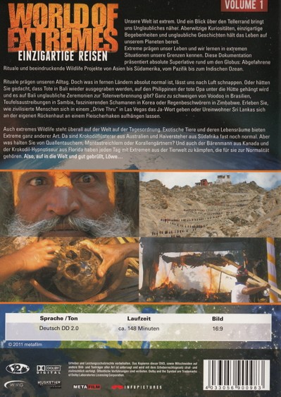 Extreme prägen unser Leben und wir lernen in extremen Situationen unsere Grenzen kennen. Diese Dokumentation präsentiert absolute Superlative rund um den Globus: Abgefahrene Rituale und beeindruckende Wildlife Projekte von Asien bis Südamerika, vom Pazifik bis zum Indischen Ozean.