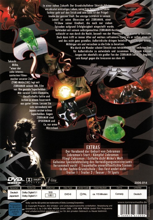 Shinichi Ichikawa ist Grundschullehrer, Familienvater und nicht sehr stolz auf sein Leben. Die Frau geht fremd, die Tochter prostituiert sich, der Sohn wird in der Schule gehänselt. Zur Zerstreuung flüchtet er in sein Kämmerlein. Dort bastelt er an Wünschen, Träumen und einem Kostüm von "Zebraman", dem Helden jener gefloppten Fernsehshow aus vergangenen Kindestagen. In voller Montur schleicht er damit nachts durch die Gärten und Gassen der Stadt! Doch dann kommt alles anders. Per Zufall trifft Zebraman auf Lobsterman, ein übler Irrer mit Krabbenkopf, Killerschere und einem Fetisch für BHs. Im darauf folgenden Kampf brechen, in dem als "Zebraman" verkleideten Lehrer, die Superkräfte durch. Zur gleichen Zeit plant eine Armee kleiner grüner Männchen, vom Keller unter der Schulsporthalle aus, die Welteroberung.