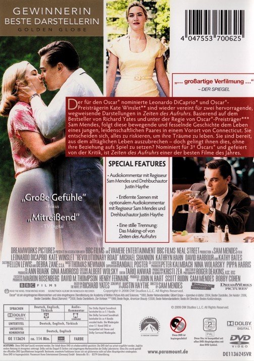 Der für den Oscar nominierte Leonardo Di Caprio und Oscar-Preisträgerin Kate Winslet sind wieder vereint für zwei hervorragende und weweisende Darstellungen in Zeiten des Aufruhrs. Basierend auf dem Bestseller von Richard Yates und unter der Regie von Sam Mendes , folgt diese bewegende und fesselnde Geschichte im Leben eines jungen, leidenschaftlichen Paares in einem Vorort von Connecticut. Sie entscheiden sich, alles zu riskieren, um ihre Träume zu leben. Sie sind bereit aus dem alltäglichen Leben auszubrechen - doch gelingt Ihnen dies, ohne ihre Beziehung aufs Spiel zu setzten?