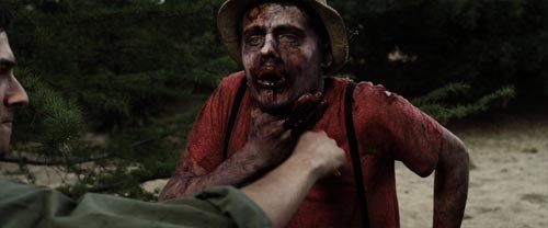 Tja, was nicht so alles passieren kann, wenn man sich unglücklich verliebt. Davon kann der eine oder die andere sicher eine ganze Oper singen, aber was in Zombies-An Undead Road Movie abgeht, ist wirklich krass. Denn plötzlich wird aus einer netten Teenagerkomödie der absolute Zombie-Horror, eine hervorragende Mischung aus Zombieland und Warm Bodies . Anders gesagt: Postapokalyptische Zombie-Survival-Action gespickt mit einer blutigen Portion schwarzem Humor. Hier nimmt sich das Zombie-Genre wirklich selbst auf die Schippe... Für diesen kurzweiligen Genremix aus dem Jahre 2013 gelang es Regisseur Jarret Tarnol sowohl mit dem Hauptdarsteller Reece Thompson ( Daydream Nation , Vielleicht lieber morgen ) als auch mit den Nebendarstellern- unter anderem mit Roger Bart ( Harold und Kumar , The Producers ) und Todd Stashwick ( Ich, du und der Andere , ...und dann kam Polly )- einen guten Fang zu machen. Und so schwärmt Artie (Reece Thompson) zu Beginn des Movies schon seit der Sandkiste für April (Rebekah Brandes, Das Tor zur Hölle, Bellflower ), dem klassischen Mädchen von Nebenan. Doch als er endlich den Mut findet, ihr seine Liebe zu gestehen, erfährt er, dass sie wegziehen wird. Das versetzt Artie in eine tiefe Depression, die er erst drei Jahre später überwunden hat. Er beschließt nun, seine Angebetete zu suchen. Auf dem Weg dorthin hat er allerdings einen Autounfall und als er wieder erwacht, befindet er sich unversehens inmitten einer Zombieplage. Auf der Suche nach seiner großen Liebe entwickelt Artie sich vom Nerd zu einem knallharten Untoten-Schlächter, der alles niedermetzelt, was sich ihm in den Weg stellt. Und das sind wirklich so einige Hindernisse. Aber was tut man nicht alles für die Liebe...
