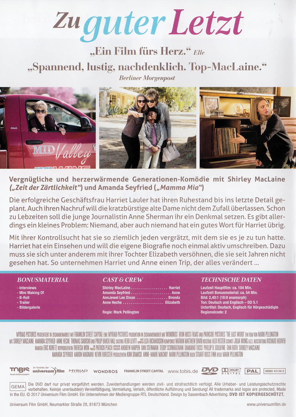 Die erfolgreiche Geschäftsfrau Harriet Lauler hat ihren Ruhestand bis ins letzte Detail geplant. Auch ihren Nachruf will die kratzbürstige alte Dame nicht dem Zufall überlassen. Schon zu Lebzeiten soll die junge Journalistin Anne Sherman ihr ein Denkmal setzen. Es gibt allerdings ein kleines Problem: Niemand, aber auch niemand hat ein gutes Wort für Harriet übrig. Mit ihrer Kontrollsucht hat sie so ziemlich jeden vergrätzt, mit dem sie es je zu tun hatte. Wie soll da ein liebenswertes Porträt der zukünftig Verstorbenen entstehen? Harriet hat ein Einsehen und will die eigene Biografie noch einmal aktiv umschreiben. Dazu muss sie sich unter anderem mit ihrer Tochter Elizabeth versöhnen, die sie seit Jahren nicht gesehen hat. So unternehmen Harriet und Anne einen Trip, der alles verändert...