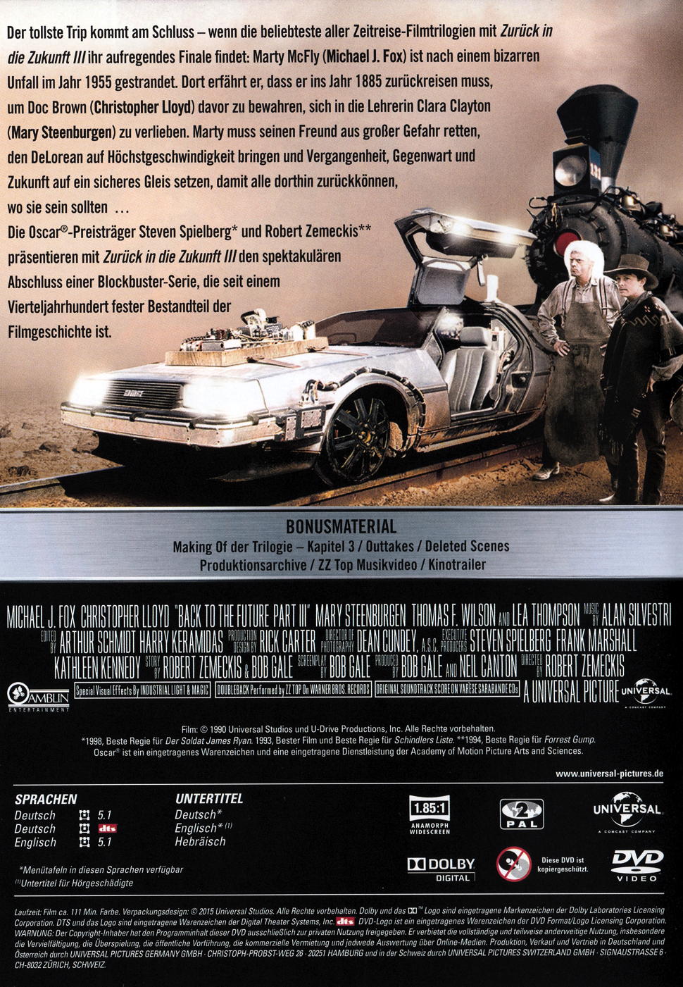 Marty McFly und Doc Emmet Brown sind wieder unterwegs durch die Zeit. Diesmal führt ihre unglaubliche Reise in den Wilden Westen des Jahres 1885, in das verschlafene Gangsternest Hill Valley. Dort entdeckt Marty den Grabstein von Doc Emmet und stellt entsetzt fest, dass 1885 das Todesjahr des Professors ist. Wenn sein Freund am Leben bleiben soll, muss er ihn rechtzeitig zurück in die Zukunft katapultieren. Akuter Kraftstoffmangel, feindliche Indianer und die rauhen Sitten des Wilden Westens machen Docs Rettung zu einem schweren Stück Arbeit...