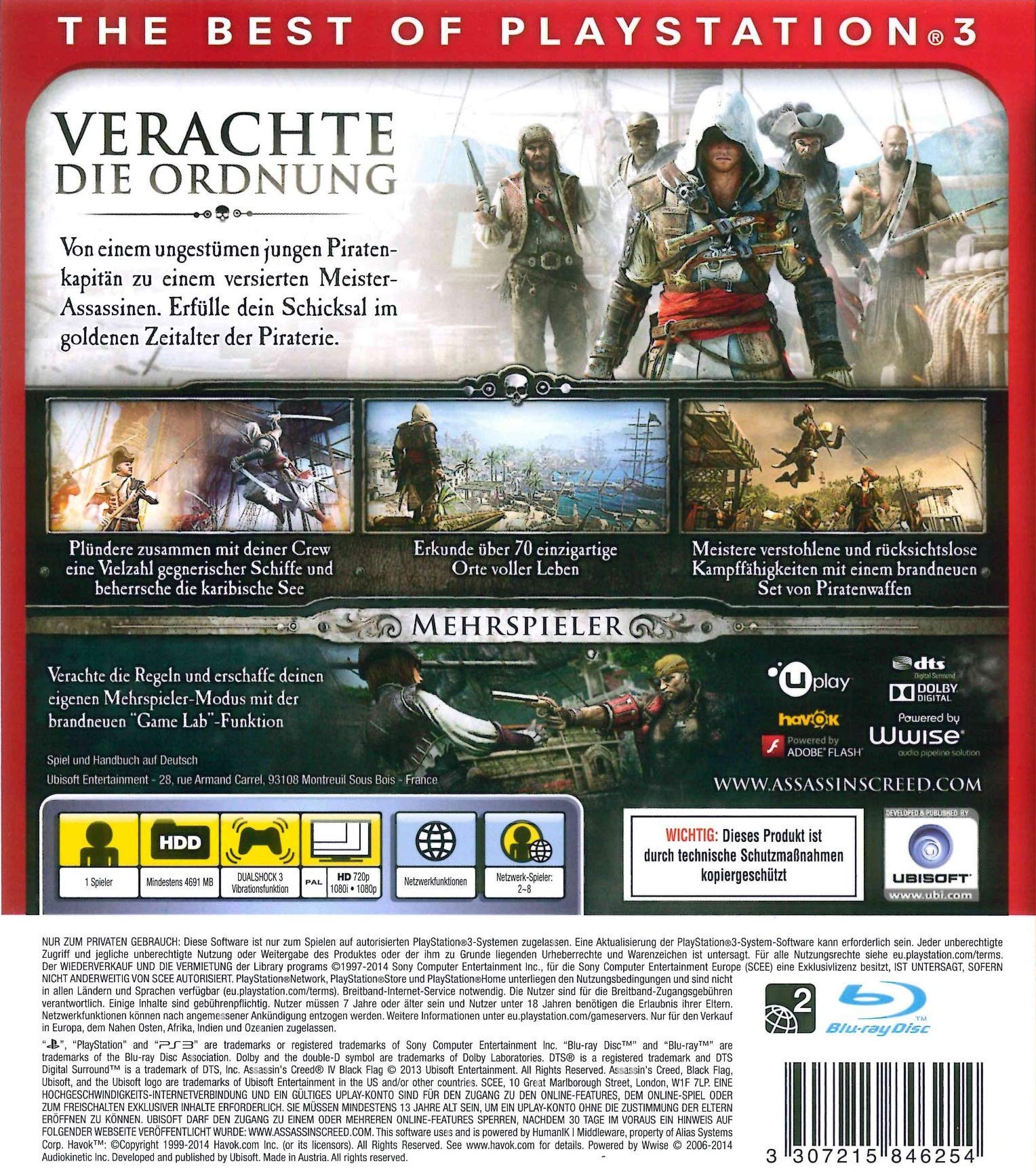 Das Spielgefühl von Asssassins Creed 4: Black Flag orientiert sich an den bewährten Grundsätzen der Reihe. Das Spiel bietet eine riesige offene Spielewelt mit mehr als 50 Schauplätzen. Der Kampf kombiniert die Bewaffnung der Assassinen mit der Ausrüstung des Zeitalters und belohnt waghalsiges als auch leises Vorgehen. Der bekannte Mehrspielermodus der Reihe wird in Assassins Creed 4: Black Flag abwechslungsreicher und gnadenloser denn je.