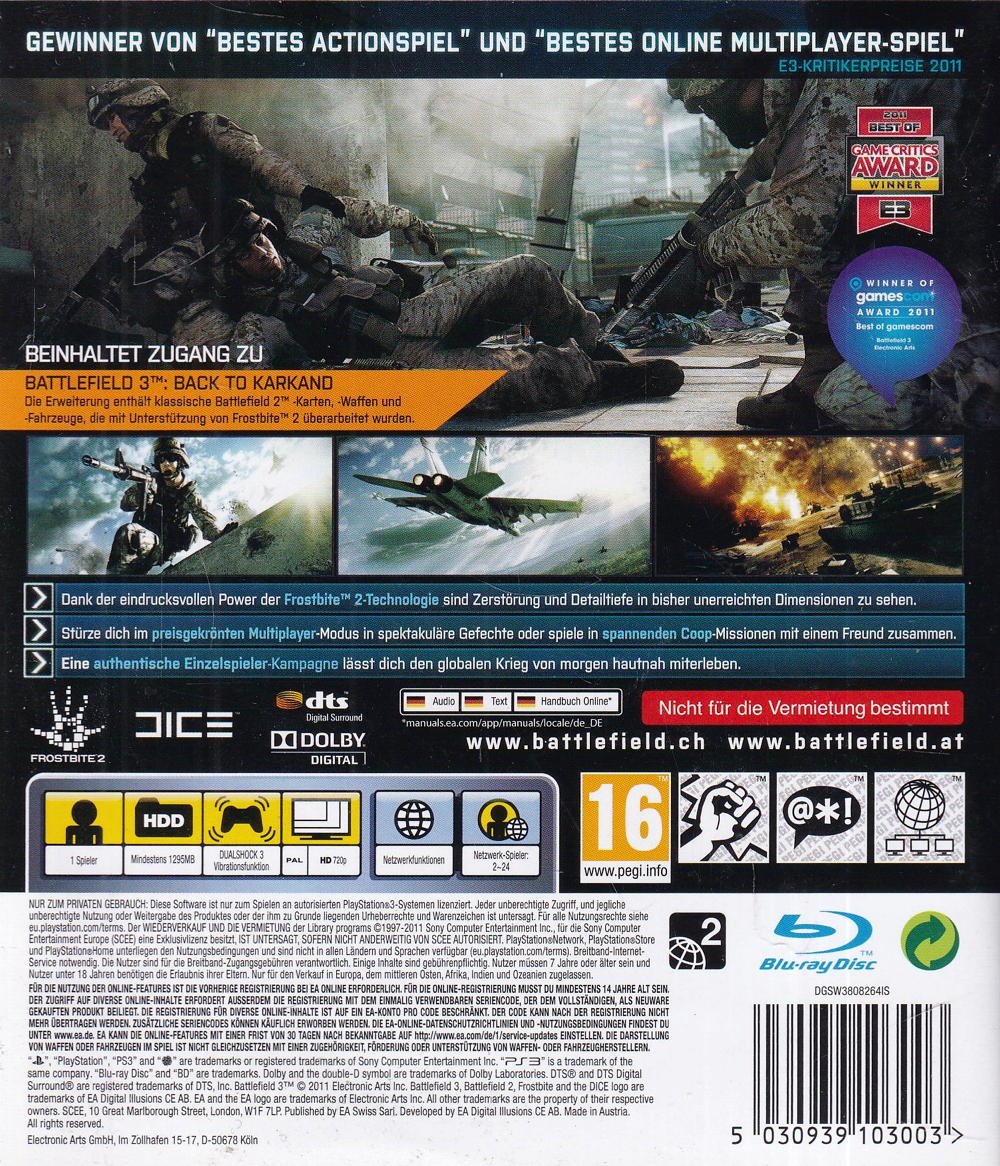 Die Battlefield 3 Limited Editionbeinhaltet Battlefield 3: Back to Karkand. In dieser Multiplayer-Spielerweiterung werden die Grafik, Zerstörungsoptionen und Spielmechanik von vier legendären Battlefield 2-Karten mithilfe der Frostbite 2-Engine zu neuem Leben erweckt. Abgerundet wird das Paket durch klassische Battlefield 2-Waffen und Fahrzeuge, einzigartige Belohnungen sowie neue Erfolge bzw. Trophäen.