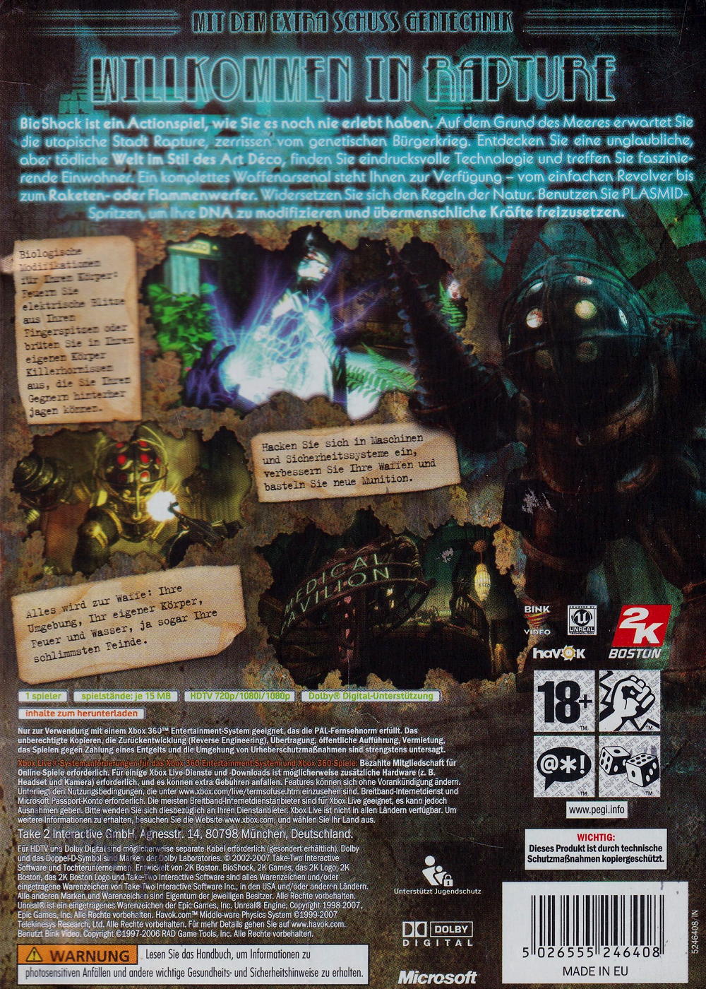BioShock ist ein Actionspiel, wie Sie es noch nie erlebt haben. Auf dem Grund des Meeres erwartet Sie die utopische Stadt Rapture, zerrissen vom genetischen Bürgerkrieg. Entdecken Sie eine unglaubliche, aber tödliche Welt im Stil des Art Déco, finden Sie eindrucksvolle Technologie und treffen Sie faszinierende Einwohner. Ein komplettes Waffenarsenal steht Ihnen zur Verfügung - vom einfachen Revolver bis zum Raketen- oder Flammenwerfer. Widersetzen Sie sich den Regeln der Natur. Benutzen Sie PLASMID-Spritzen, um Ihre DNA zu modifizieren und übermenschliche Kräfte freizusetzen.