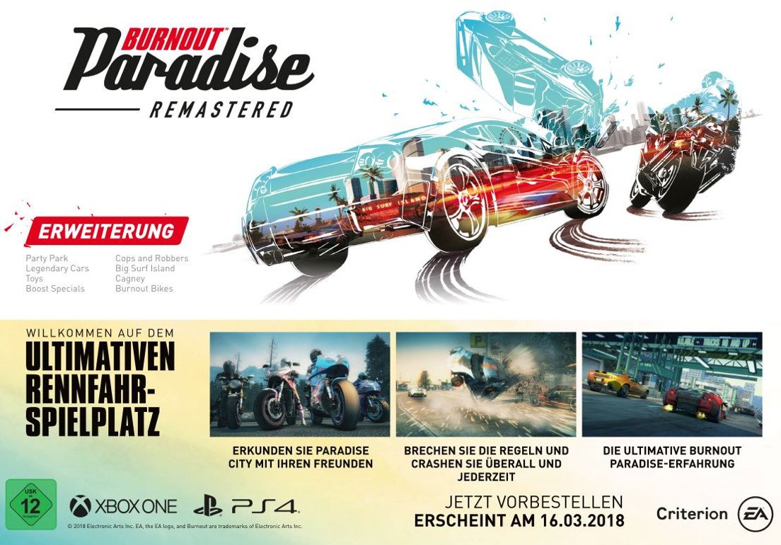 Mache „Action“ zu deinem zweiten Vornamen, wenn du in Burnout Paradise Remastered über die Strasse herrschst! Tob dich auf dem ultimativen Rennfahr-Spielplatz aus, vom hektischen Innenstadtverkehr bis hin zu wilden Gebirgsstrassen. Erlebe die hochoktanigen Stunts und mutwillige Zerstörung erneut in einem der grossartigsten Arcade-Rennspiele aller Zeiten!
