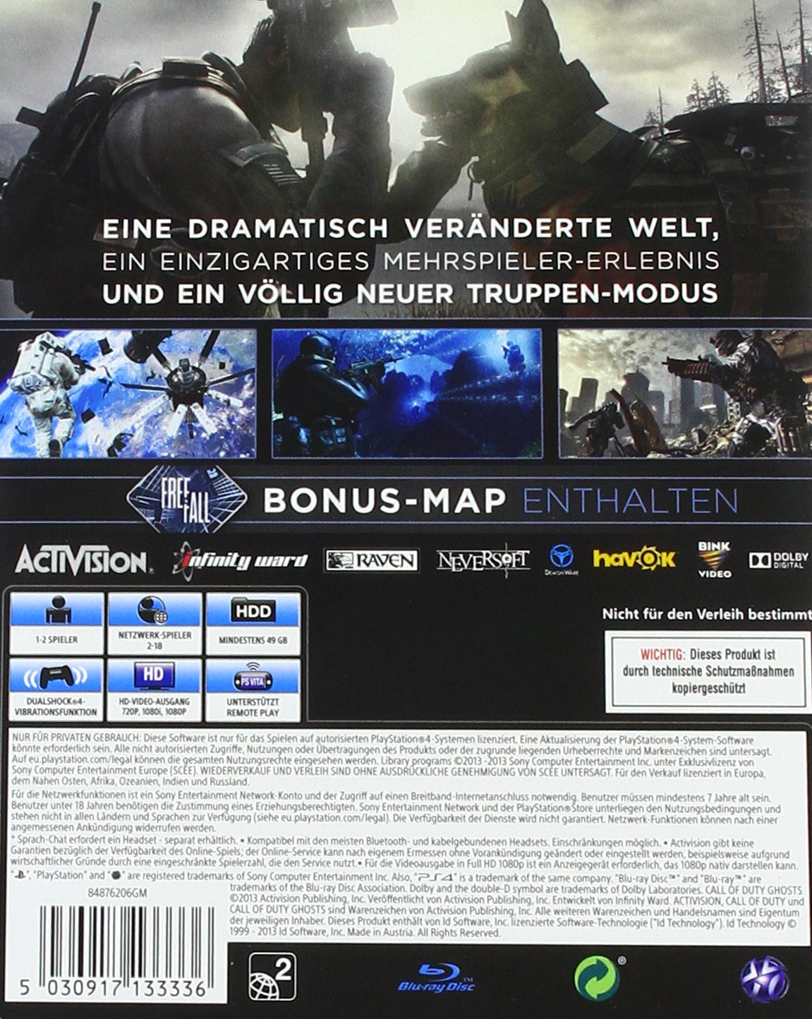 Call of Duty: Ghosts, das eine der grössten Entertainment-Marken der Welt einen gewaltigen Schritt nach vorne bringt. Das neueste Kapitel in der Call of Duty-Reihe wartet mit frischen Ideen auf und versetzt die Spieler auf die Seite einer gelähmten Nation, die nicht mehr um Recht und Freiheit kämpft, sondern ums nackte